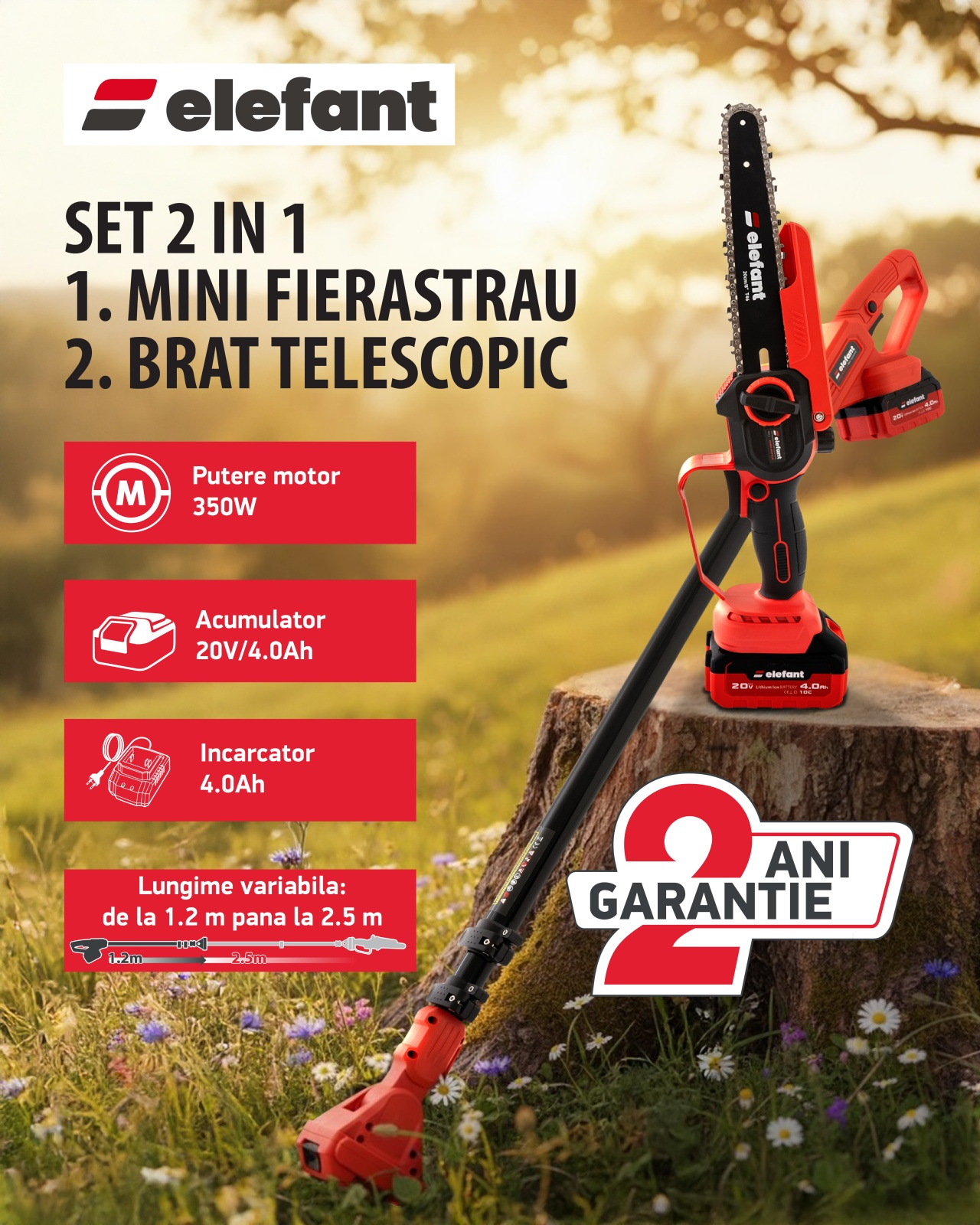 Setul ELEFANT ESBS-8EP2.5 este un ajutor de nădejde pentru orice gospodărie, grădină sau livadă, fiind conceput special pentru a îmbina puterea unui utilaj modern cu mobilitatea și siguranța utilizării. Acest model vine echipat cu o mini drujbă de 8" (20 cm), puternică și compactă, care se remarcă printr-un motor brushless de înaltă eficiență, ce dezvoltă o putere maximă de 350 W. Acumulatorul inclus, de 20V / 4.0Ah, asigură o autonomie excelentă și o performanță constantă, fără a depinde de cabluri sau surse de curent externe.