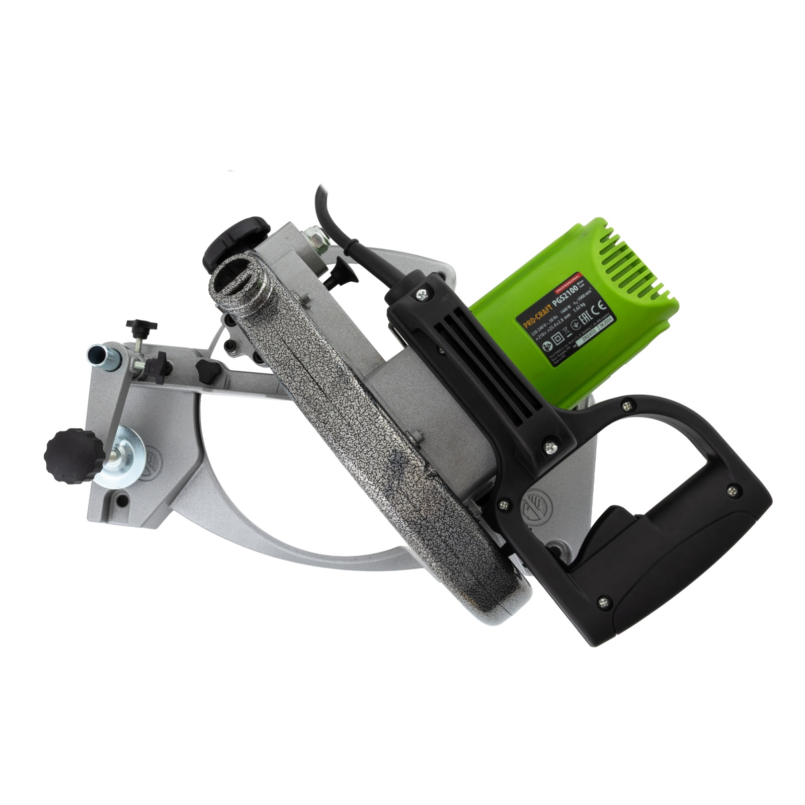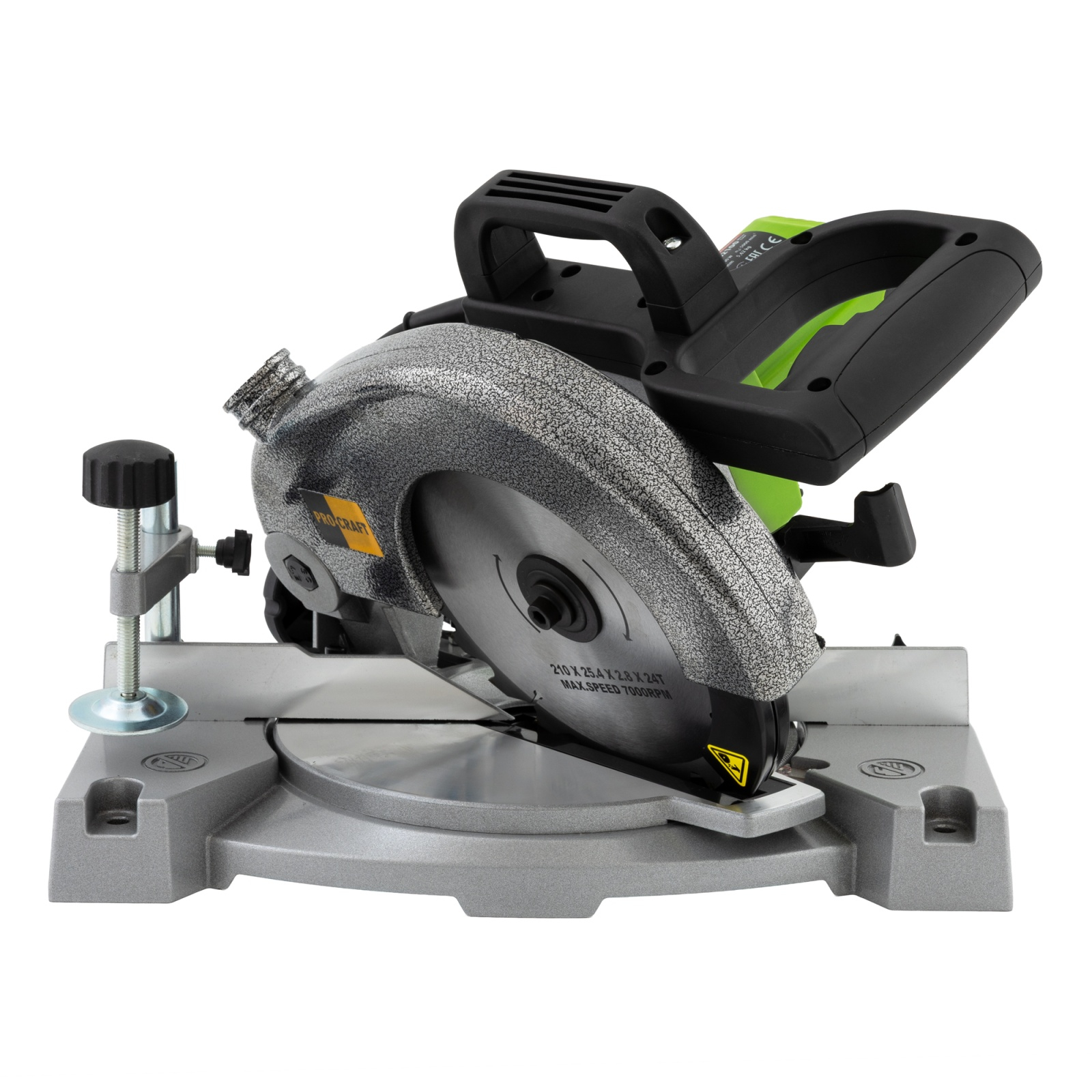 Fierastrau Circular stationar Procraft PGS2100 cu panza de 210 mm diametru si orificiu de montare de 25.4 mm. Produs conceput pentru sectionarea materialelor lemnoase sub unchi inclinat orizontal sau vertical. Platforma de 390 mm din aluminiu, cu limitator permite ajustarea unghiului de taiere vertical pana la 45 de grade necesar la imbinarea profilelor in lucrarile de constructii sau atelier. Talpa poate fi fixata de un suport orizontal pringaurile special prevazute. Bratul cu motorul poate fi deasemenea pozitionat sub unghi de maxim 45 de grade. Panza este protejata pe toata circumferinta de aparatoare fixa si cea retractabila. Aparatoare fixa din aliaj de aluminiu este prevazuta cu orificiu de conectare la aspirator. Acest circular stationar Procraft PGS2100 este dotat cu un motor de 1.4 kW care tureaza discul pana la 5000 de rotatii pe minut. Zonele recomandate de folosire sunt atelierele mici si santierele unde intensitatea de utilizare nu este intensa. Caracteristici generale Tip - Circular electricTip taiere - Cu panza circularaTip lucrare - Semi-ProfesionalContinut pachet 1 x Cheie pentru demontare panza 1 x Disc abraziv 210 mm Functii & Recomandari Taiere sub unghi de 45 grade Suprafata lucru LemnAvantajeAcces rapid la carbuni, doi carbuni/doua capace/doua suruburiProtectie pentru panza Schimbare rapida a discului Transmisie directa Grosime max de taiere - 50 mm
