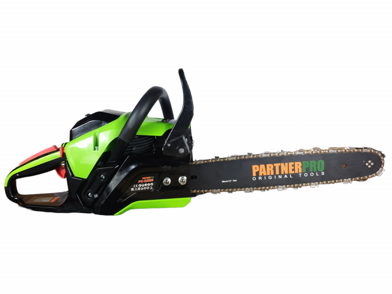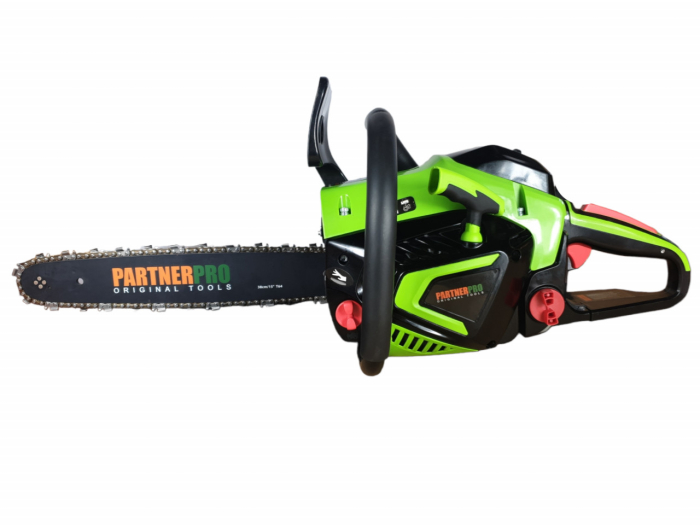 PS5200 drujba pe benzina PARTNERPROMotofierastraul pe benzina PartnerPRO PS5200 dezvolta o putere de 5KW(6.7CP), avand o turatie de 3400 rotatii pe minut. Cu un design modern si compact, drujba este perfecta pentru lucrul in gospodarie precum taierea lemnelor de foc, toaletare copaci, arbusti, taiere scanduri. Lama este de 38 cm Tip produs: Motofierastrau (drujba) pe benzina Brand: PartnerPRO Model: PS5200 Capacitate cilindrica (cm3): 52 cm³ Putere ( W/CP/KW): 5000W/ 5KW/ 6.7CP Tip motor: 2 timpi Combustibil: Amestec (benzina 1L: ulei in doi timpi 25 ml) Capacitatea rezervorului de combustibil (ml): 0.55L Ulei pentru lant: Ulei ungere Capacitatea rezervorului de ulei (ml): 0.26L Tip pornire: Manual (la sfoara) Viteza de rotatie: 3400RPM Pas lant: 3.25 Numar dinti lant: 32/ 36 dinti Pinteni: 64/72 Lungime lama: 38 cm