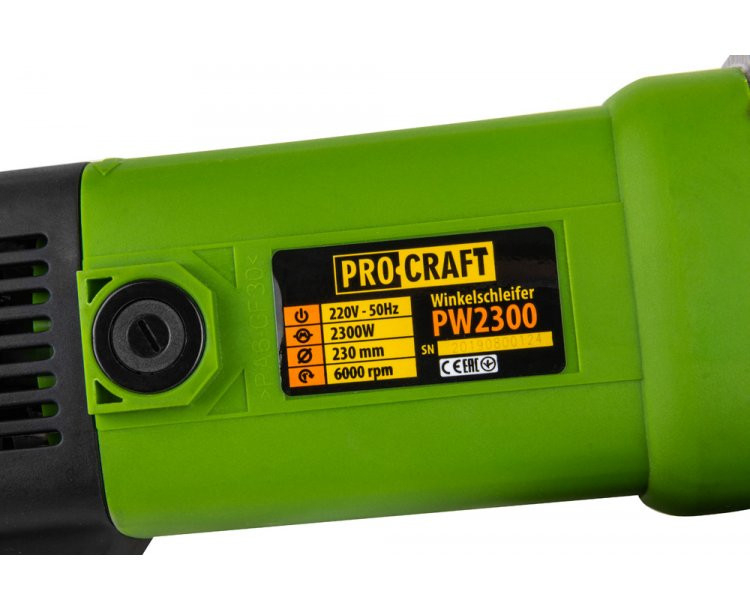 Flex Polizor Unghiular Procraft PW 2300, 2.3 kW, , 230 mm, pornire lenta Flex polizor unghiular Procraft PW2300 este compatibil cu panza cu diametrul de 230 mm . Carcasa angrenaj este confectionata din aliaj gros din aluminiu, cu trei pozitii de montare a manerului de sustinere. Mecanismul interior este la fel de dur, conceput din piese calitative, pentru a rezista muncilor semi-profesionale, din gospodaria proprie sau proiecte mici/medii de constructii. Este pus in functiune de un motor de putere 2.3 kW, ce transmite catre ax o turatie de 6500 de rotatii. Bobinajul motorului este izolat in doua straturi de lac pentru a preintampina supra-incalzirea si defectiunile premature. Setul include o pereche de carbuni, ce se pot monta prin simpla desurubare a buzunarelor laterale, situate langa maner. Manerul de baza este prevazut cu doua grile de ventilare, ce permit curentului de aer sa strabata intrebul corp al polizorului unghiular PW2650 si evacuat prin grilele din frontalul flexului. In acelasi timp, curentul de aer evacuat, va inlatura si praful din zona de contact a panzei, pentru o vizibilitate mai buna.