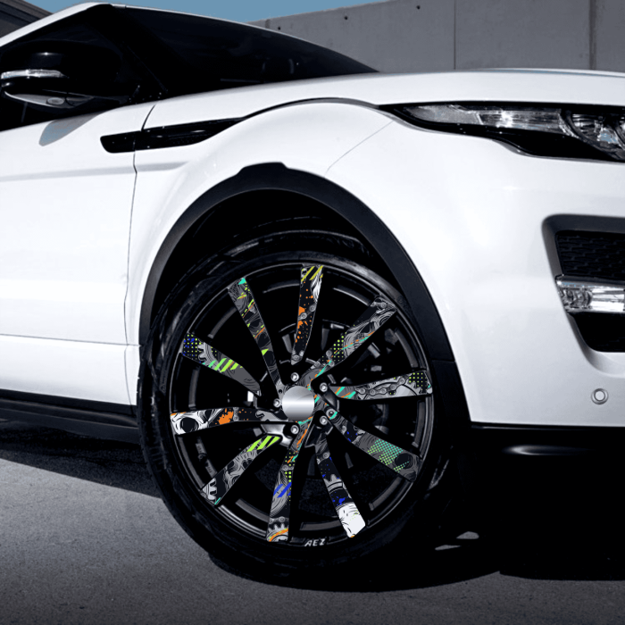 Set Folii Auto pentru Colantare Jante, un produs de inalta calitate imprimat cu Solventi Outdoor, rezistenta indelungata la exterior, dedicat pasionatilor de tuning, competitii auto, show-uri auto. Dimensiunea produsului (Ø 60 cm) este suficienta pentru a colanta jante de pana la 21".