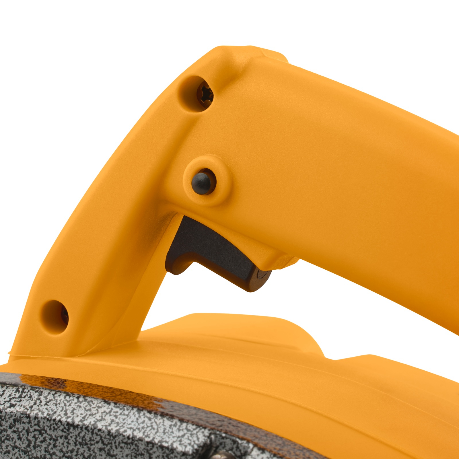 Construcția echilibrată (aprox. 2,5 kg) și talpa din aluminiu fac ca rindeaua să alunece lin, reducând solicitarea brațului. Mânerul ergonomic cu acoperire Soft-Grip oferă control total, mai ales la debitări lungi, iar placa în "V" din talpă te ajută să teșești instant muchiile fără bâjbâială sau repoziționări. În plus, sistemul de siguranță dublu previne pornirea accidentală și protejează motorul la suprasarcină.