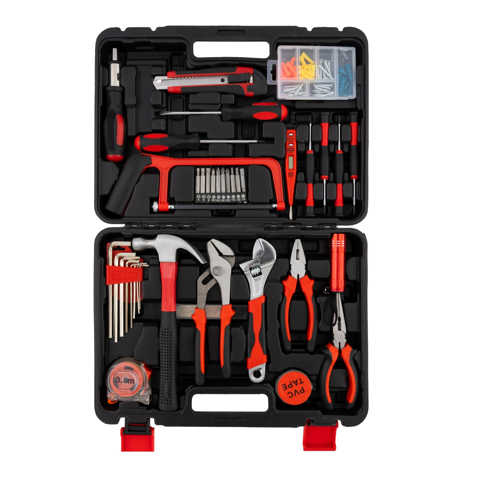 • Include biti prelungiți, surubelnite cu cap rotativ, bomfaier, surubelnite rigide, surubelnita cu cap interschimbabil, cutter, dibluri cu surub, creion de tensiune, chei imbus, ciocan, cheie reglabila, cleste papagal, patent, patent cu cioc, lanterna, ruleta de 3 metri, banda izolatoare și rezerve pentru cutter.